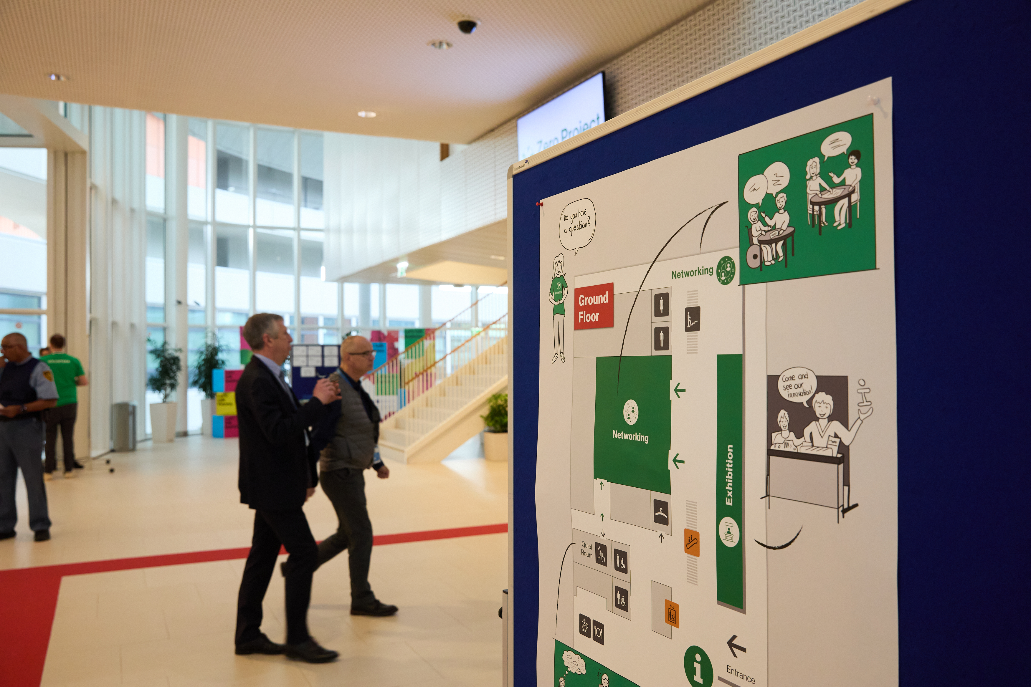 Large print signs and floor plans are placed throughout the venue to support navigation.