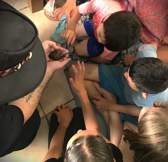 [Alt text: A group of children sits on the floor, fascinated by a small animal one adult is holding. The children's curiosity and engagement with nature reflect inclusiveness in education, where experiential learning is encouraged. This informal setting promotes tolerance and appreciation of biodiversity, nurturing awareness from a young age.]