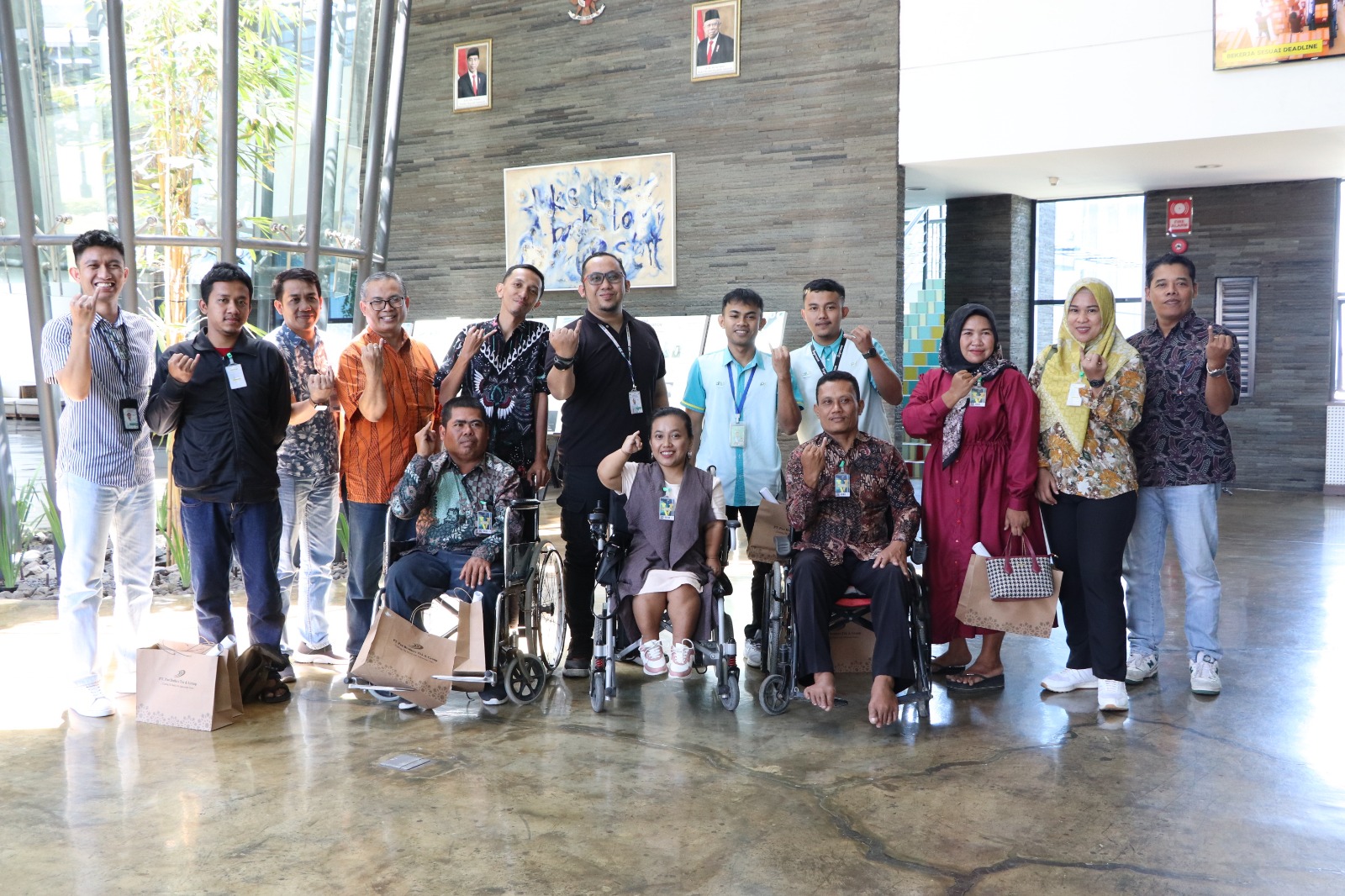 [Alt text: A group of Indonesian men and women, some in wheelchairs, pose together in a public setting. Their smiles and hand gestures create an atmosphere of unity and mutual respect. The setting promotes social inclusion and acceptance, with each individual playing an integral role within the community.]