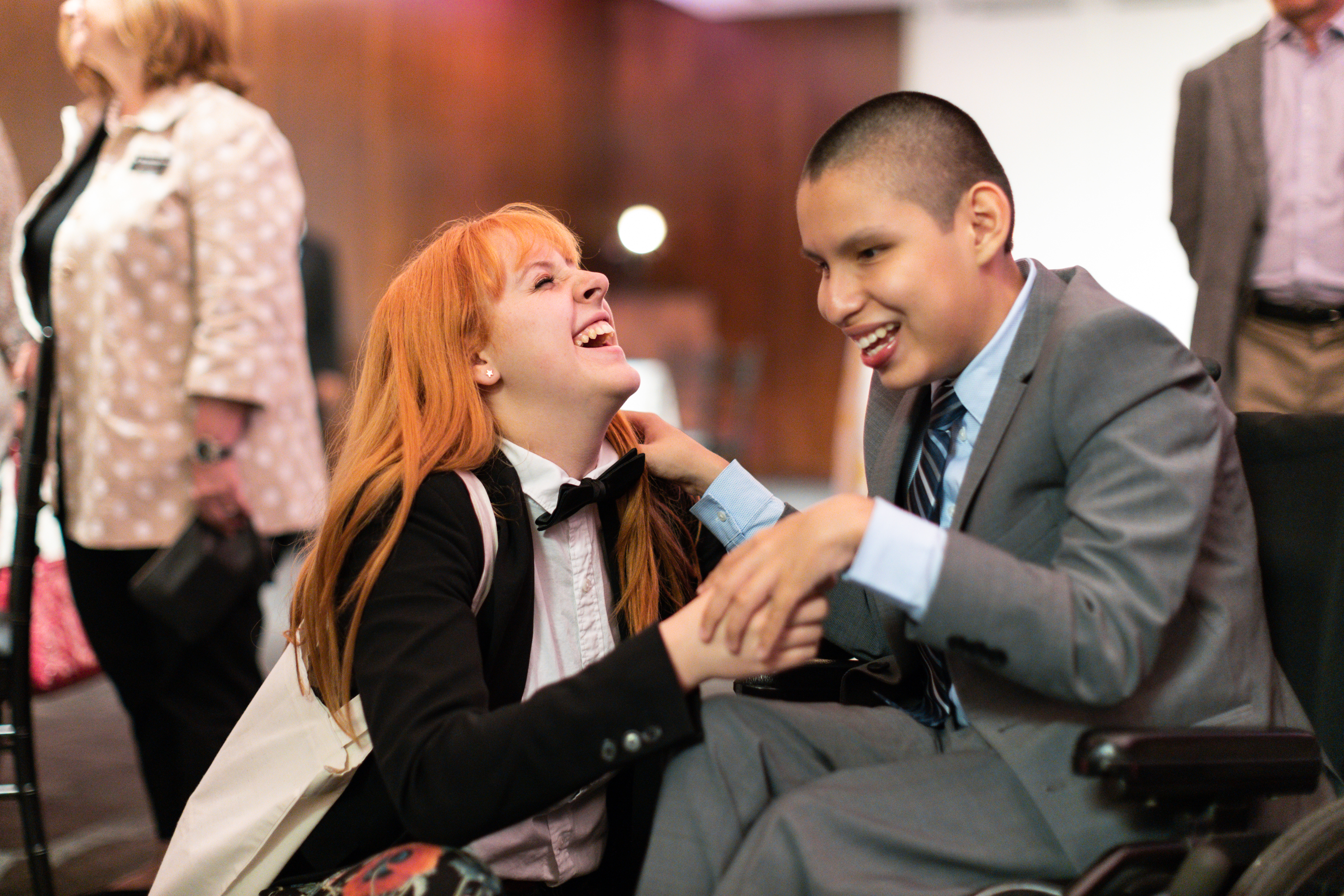 [Alt text: A young woman and a man in a wheelchair share a joyful moment, laughing together. The woman’s expression is warm and encouraging, creating a sense of mutual understanding and friendship. This image highlights the beauty of genuine connections and the inclusivity that brings people together, regardless of physical differences.]
