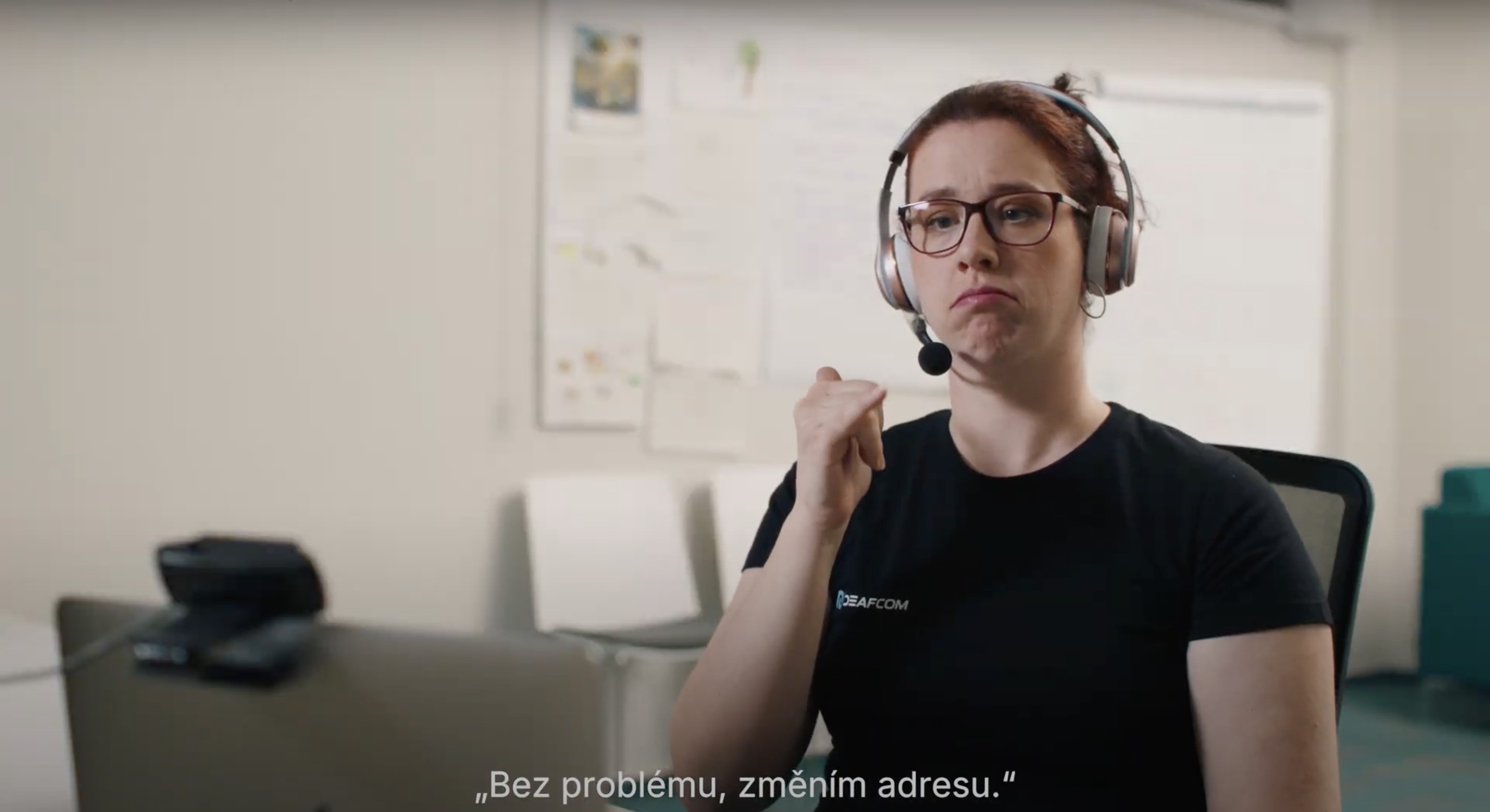[Alt text: A woman with a headset uses sign language in a customer service environment, as shown by Czech subtitles. Her professional attire and concentration emphasize the inclusivity of workplaces that accommodate sign language users, reinforcing equal opportunities in communication-focused roles.]
