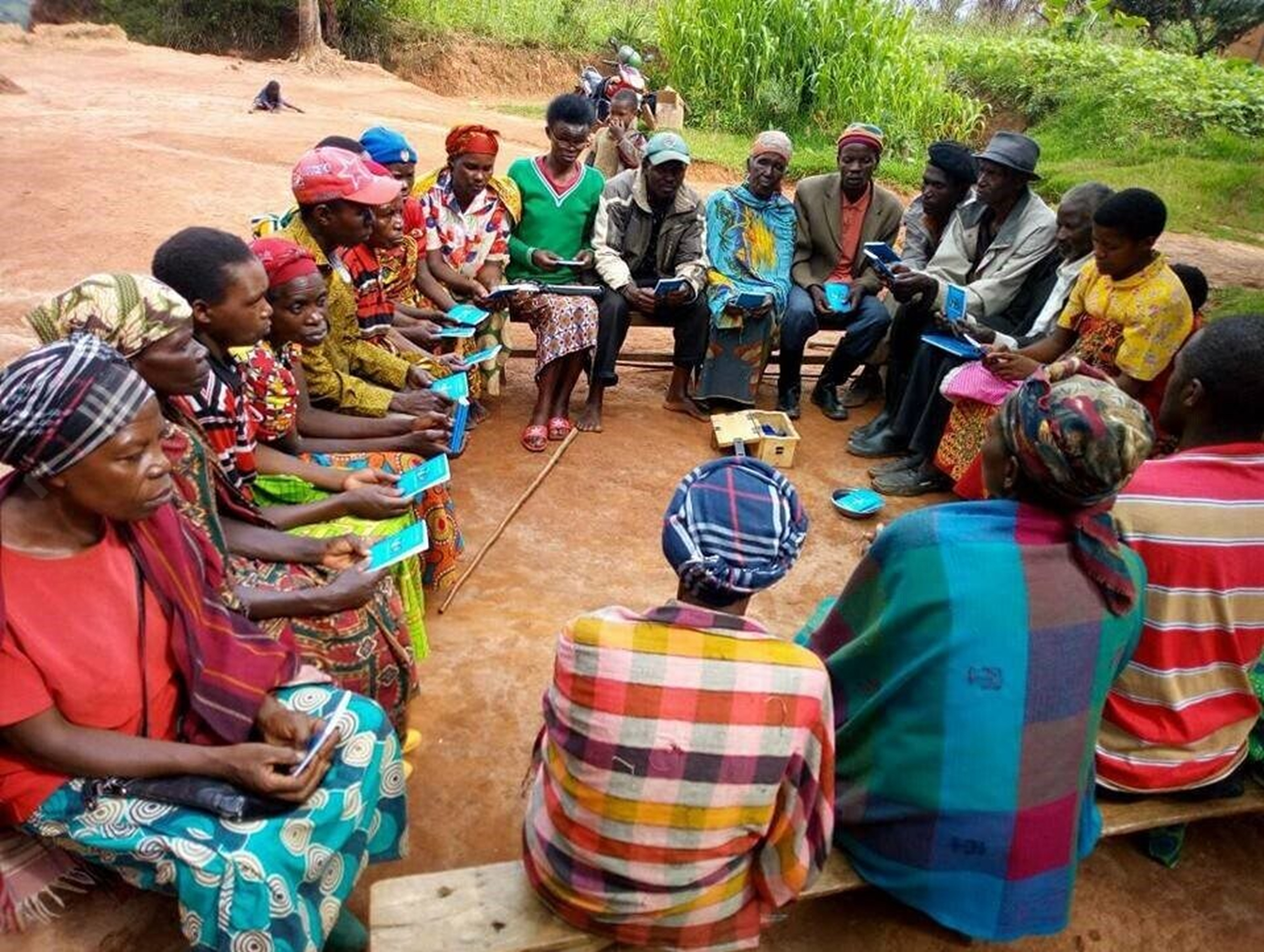 [Alt text: A group of African individuals, seated in a circle outdoors, appears engaged in a communal activity. Their attire reflects vibrant, traditional patterns. This image embodies community spirit, emphasizing cultural unity, learning, and knowledge-sharing among diverse age groups.]
