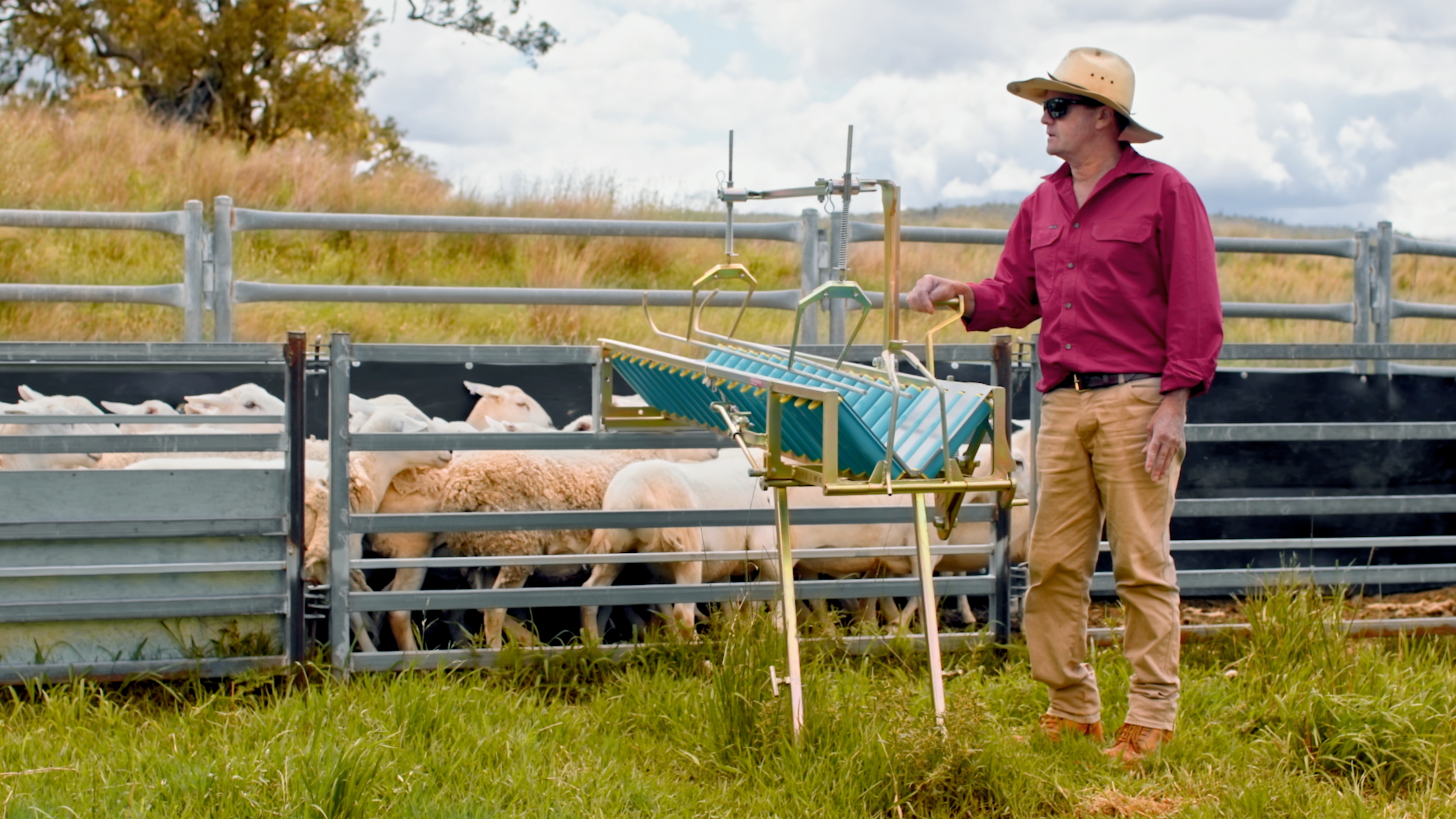 [Alt text: A man is working on his farm with sheep in the background. He is standing next to specialised farming equipment funded through JobAccess.]